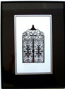 | Along with the paper cut gate, the Chruch's white pillars are cut from one-ply bristol board to anchor the gates. | Framed Size: 16" x 15" frame is black metal. | Price: $485. |